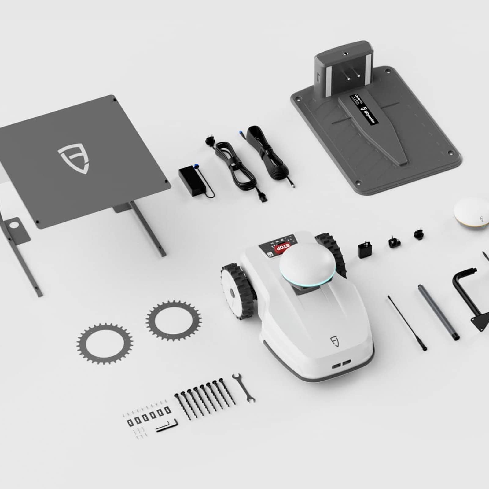 De FR4000 robotmaaier, laadstation, RTK basisstation, 6 reserve mesjes, wielspikes en alles om de maaier goed te installeren.