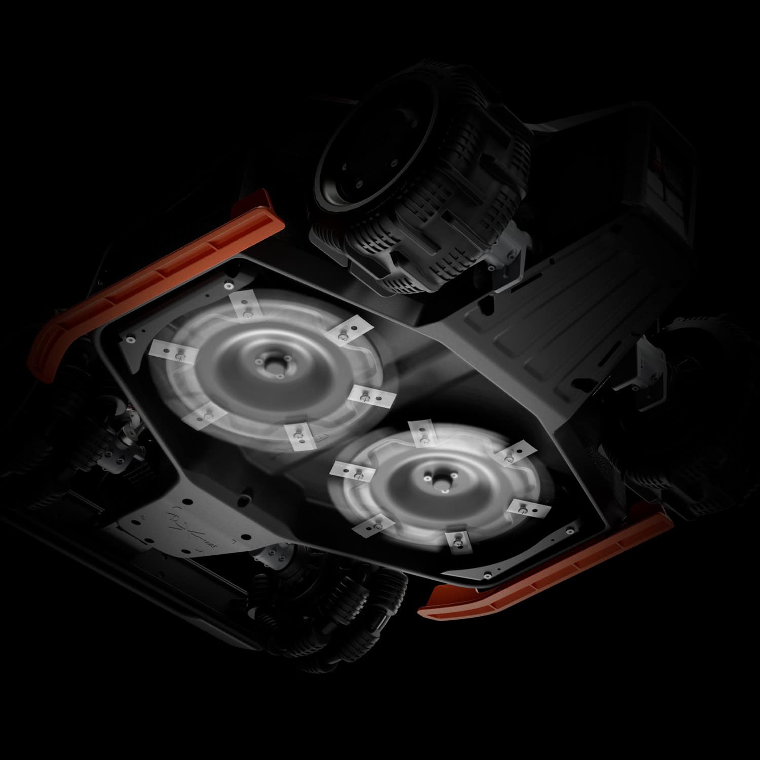 De 2 messchijven zitten op gelijke hoogte met de buitenkant van de wielen, ook wel "zero-distance edge cutting" technologie genoemd. Hierdoor kan de LUBA 2 heel dichtbij de rand maaien, zelfs langs muren of hekken.